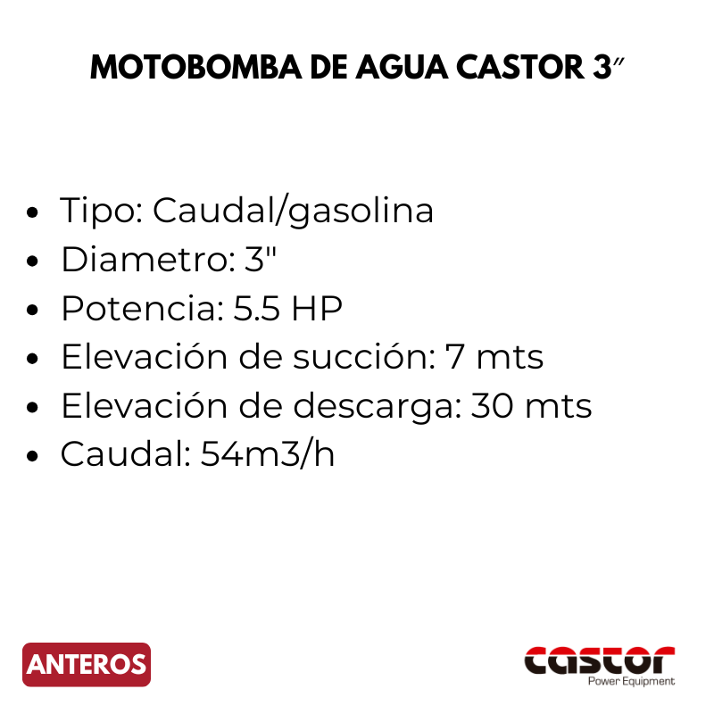 La Motobomba de Agua Castor 3″ a gasolina tiene un caudal máximo de 54 m3/h y una altura máxima de elevación de 30 metros. Está equipada con motor de 5.5 hp, con arranque manual. Ofrece 3” de diámetro de aspiración y 3” de diámetro de descarga. Diseñada para realizar la succión de grandes cantidades de agua limpia para el uso agrícola o doméstico. Ideal para el transporte de líquidos, drenaje de tanques, obtención de agua de pozo y para aumentar la presión y el caudal de agua disponible. Fabricada con materiales de alta resistencia y durabilidad, tiene un cuerpo de aluminio.