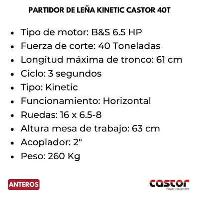 El Partidor de Leña Castor de 40 toneladas es de tipo cinético con funcionamiento horizontal y válvula de retorno automático con un tiempo de ciclo de tan solo 3 segundos.