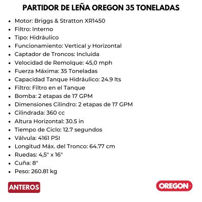 Impulsado por un motor Briggs & Stratton no quedará decepcionado. Partidor de troncos Oregon de 35 toneladas con motor Briggs & Stratton XR1450 de 360cc