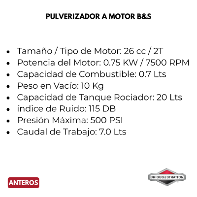 Posee un motor B&S de 2 Tiempos y un caudal de trabajo de 7.0 Litros. Posee una bomba de doble acción con pistón en acero inoxidable. Es de fácil encendido y posee una pistola graduable.