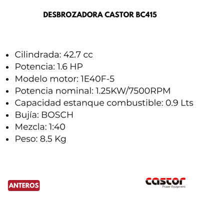 La Desbrozadora Castor BC415, con eje recto, tiene una potencia de 1.6 HP que te permitirá mantener un césped prolijo y ordenado. Te ayudará a eliminar malas hierbas y malezas en rincones donde la cortacésped no puede llegar. Este producto es ideal tanto para uso doméstico como profesional, ya que está especialmente diseñada para soportar labores exigentes. Su peso, de 8,5 kg permiten su fácil traNsporte y uso tanto por profesionales como por aficionados de su jardín.