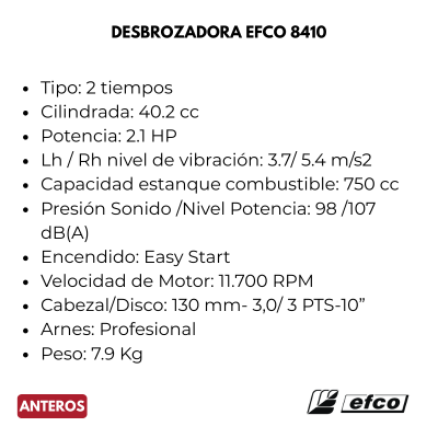 La Desbrozadora EFCO 8410 tiene características técnicas que aseguran eficacia, altas prestaciones y máxima comodidad de uso.