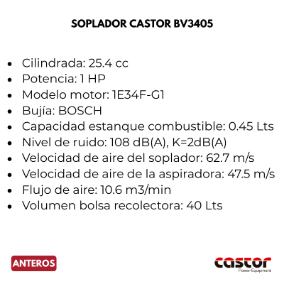 La Sopladora Castor BV3405 es una herramienta que te facilitará mantener tu jardín en orden ya que incluye cuchillos para triturar las hojas al aspirar, así como una bolsa recolectora de 40 Lts. Con su potencia de 1.0 HP, podrás despejar la zona deseada de forma rápida y sencilla. Su mango ergonómico permite un buen agarre y manipulación de la herramienta. Liviano y de fácil manejo, contribuye a la limpieza de veredas y céspedes.