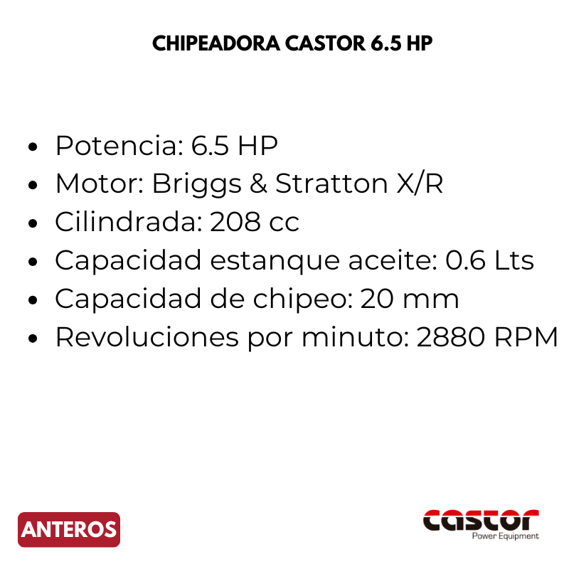 La Chipeadora Castor con motor americano Briggs & Stratton es un equipo práctico, cómodo y fácil de transportar y de operar, ideal para condominios y parcelas. Resulta ideal para reducir rápidamente el volumen de los residuos de los trabajos de poda, triturando hojas y ramas de diferentes tamaños transformándolos en chips o astillas.
