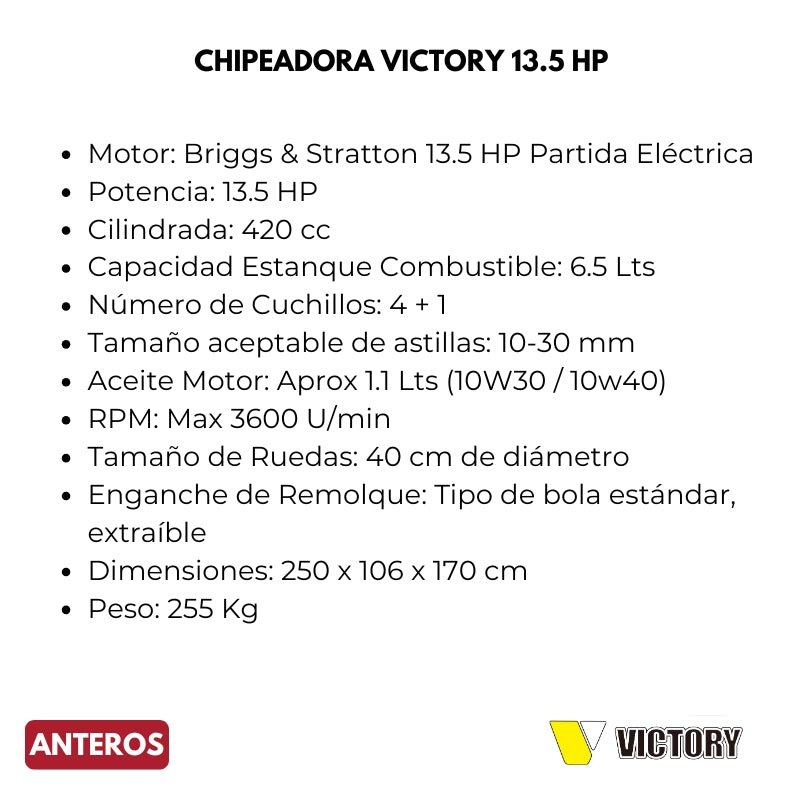 La Chipeadora Victory es un equipo especialmente pensado en aquellos usuarios profesionales o casuales que deben procesar grandes cantidades de restos de poda, ramas y hojas. Con su fiable motor Briggs & Stratton de 13.5 caballos de fuerza, la Chipeadora Victory es una excelente alternativa para reducir el volumen de desechos que pueden reutilizarse para labores de compostaje, cobertura de suelos e incluso para evitar incendios.