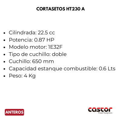 Si buscas una máquina para embellecer tu jardín, el Cortasetos Castor HT230 la herramienta ideal. Con un motor de 22,5 cc y un tamaño de cuchillo de 650 mm, posee un equilibrio perfecto entre movilidad, potencia y autonomía. Su empuñadura ergonómica rotativa te permitirá un cómodo recorte de los lados y la parte superior de los arbustos.