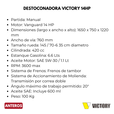 Elimine raíces y tocones de árboles de su jardín, con la Destoconadora Victory 14 HP. Las excavadoras y tractores pueden causar daños grandes y costosos a su jardín y a sus áreas pavimentadas. El Victory GSF-1500 es un potente destoconador y triturador de raíces con motor de gasolina VANGUARD de 4 tiempos de 14 CV. La destoconadora corta los tocones de los árboles con precisión e incluso las raíces difíciles se extraen en cuestión de minutos sin causar ningún daño.