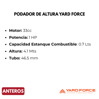 El Podador Telescópico Yard Force está especialmente diseñado para trabajos pesados y para un uso intensivo. Equipado con un motor de 2 tiempos de 33cc y 1 HP, ofrece robustez y versatilidad de uso. Ideal para trabajos de poda de ramas en altura y mantención de arbustos. El Podador Yard Force tiene un tubo telescópico extra largo, permitiendo cortar ramas de hasta 4.1 metros. Tiene una espada Oregon de 12" y una capacidad de estanque de combustible de 0.7 Lts.
